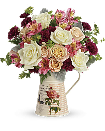 Surprise mom with this gorgeous bouquet overflowing with lush roses, red chrysanthemums, and pink Alstroemeria. Delivered in a vintage-inspired, hand-glazed watering pitcher that doubles as a quaint garden accessory, this floral selection is perfect for the mom with a green thumb or an eye for interior decorating. (Available for $49.99)